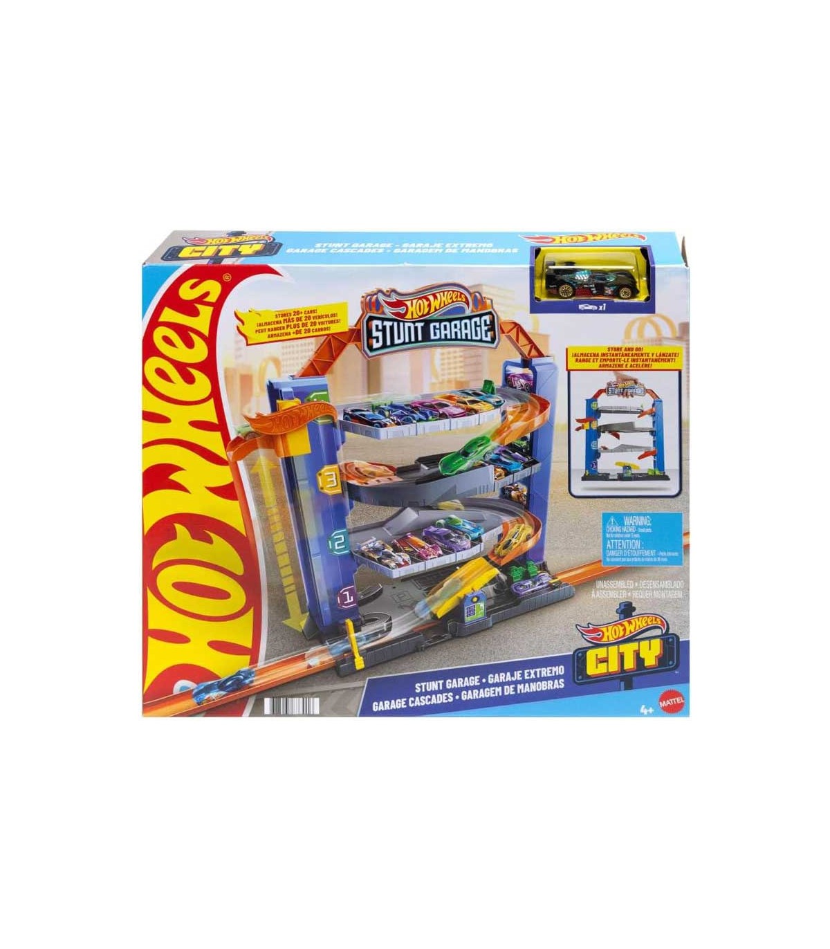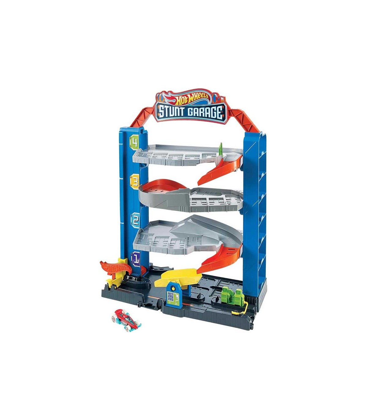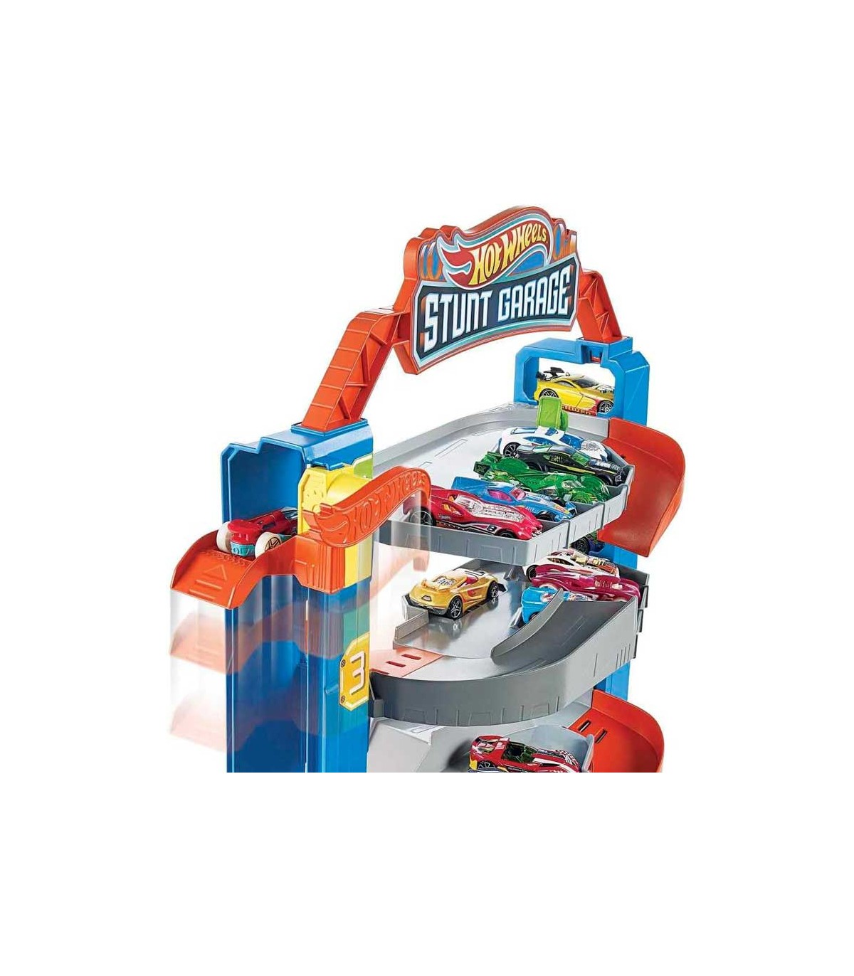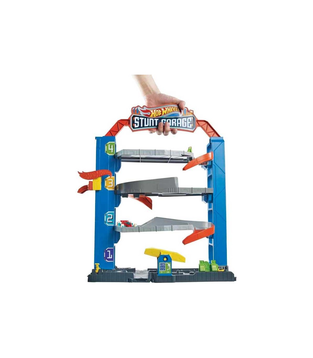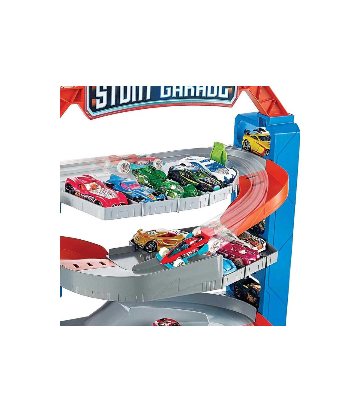 Garaje extremo Hot Wheels City, con 4 plantas y ascensor en un lateral, rampas de bajada y espacio para almacenar más de 14 vehículos Hot Wheels.
