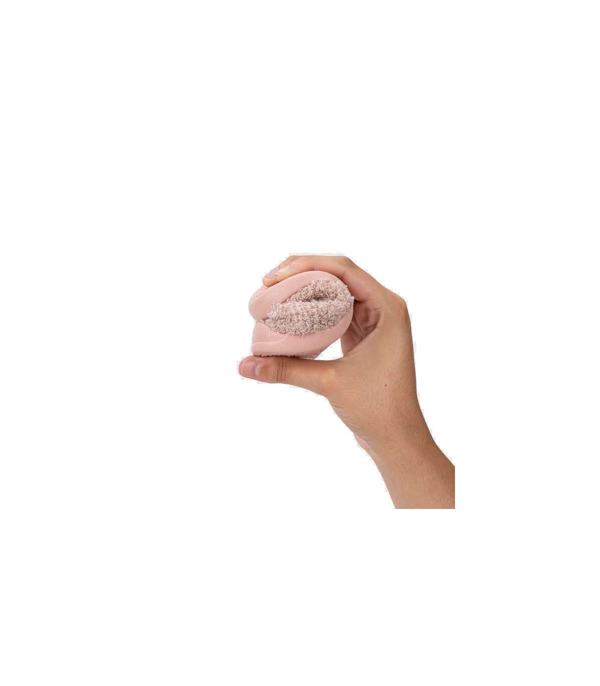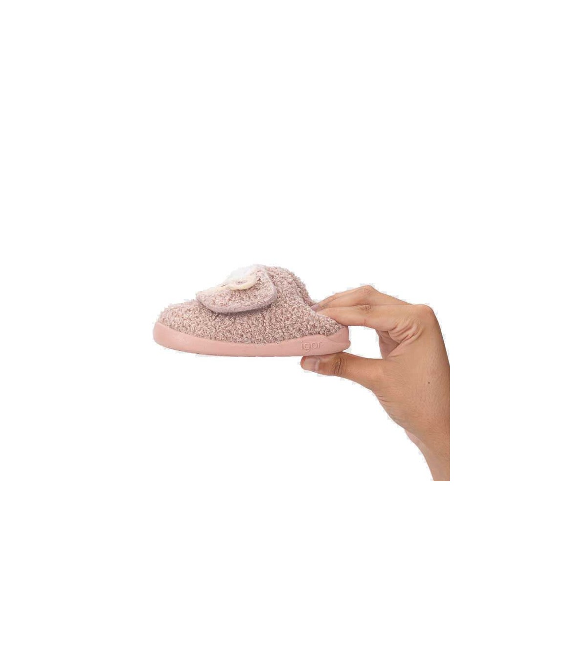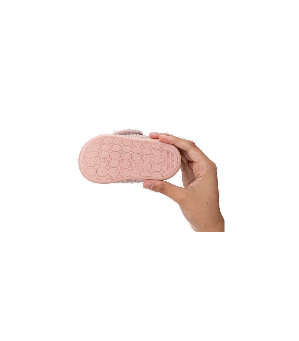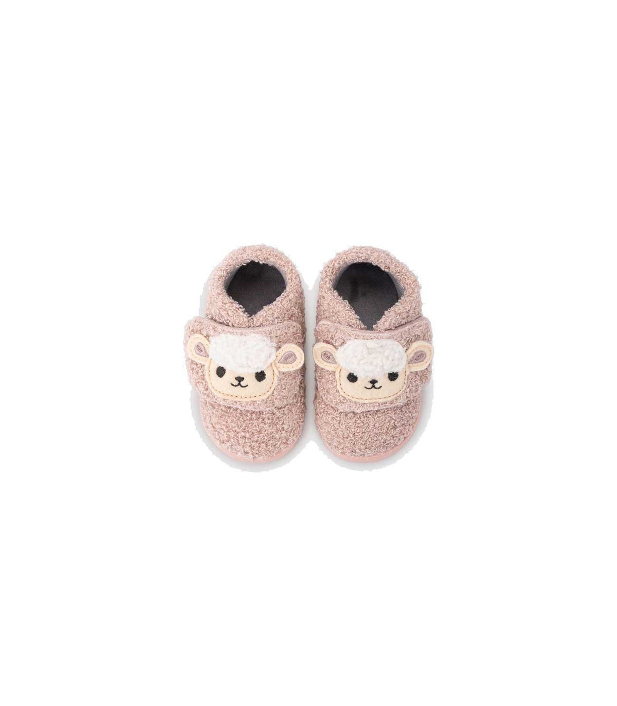 Zapatilla de estar por casa en color rosa maquillaje, con detalle de oveja, de concepto barefoot, con cero drop, flexible y blandita. Hecha con un tejido blandito, suave y calentito.